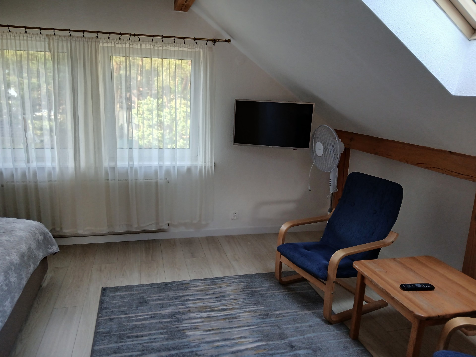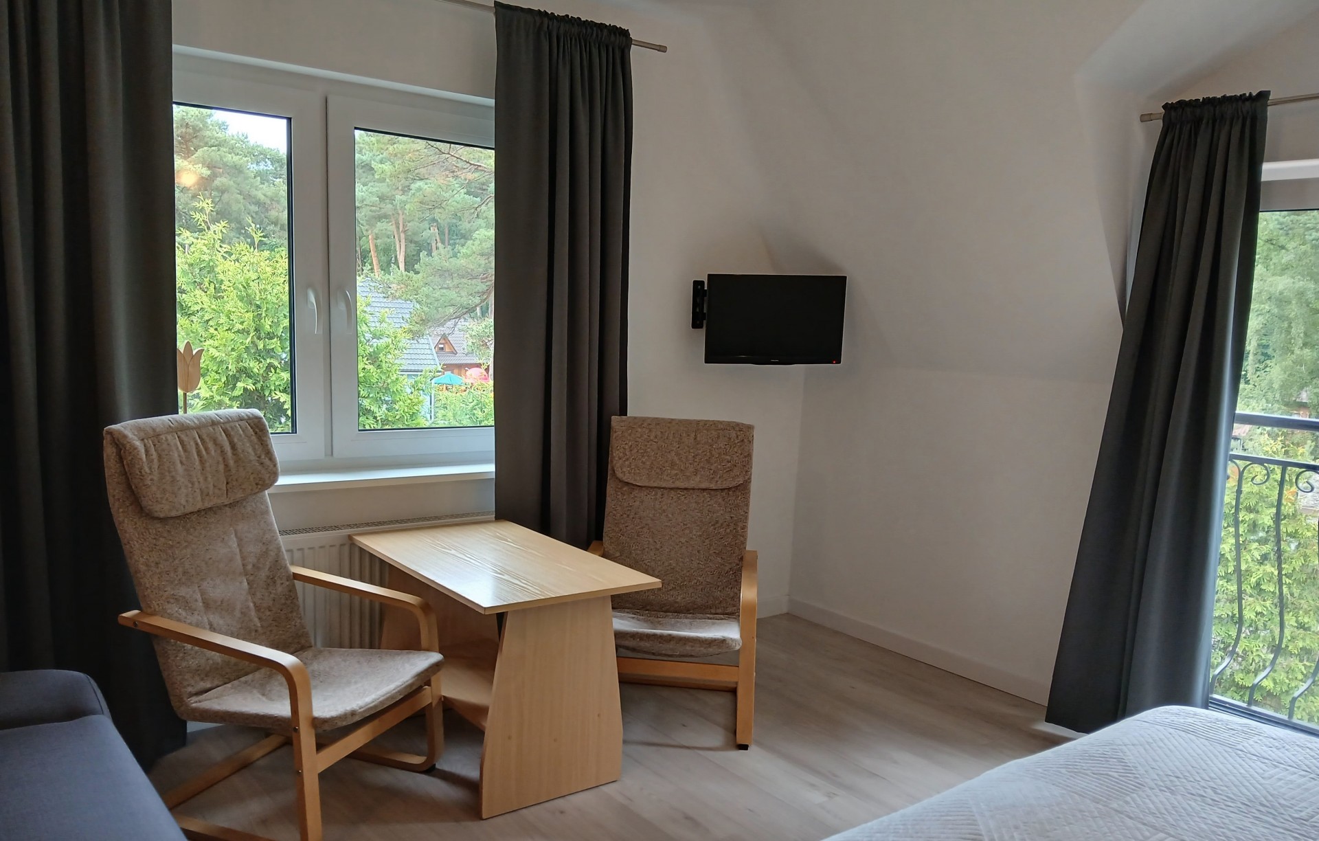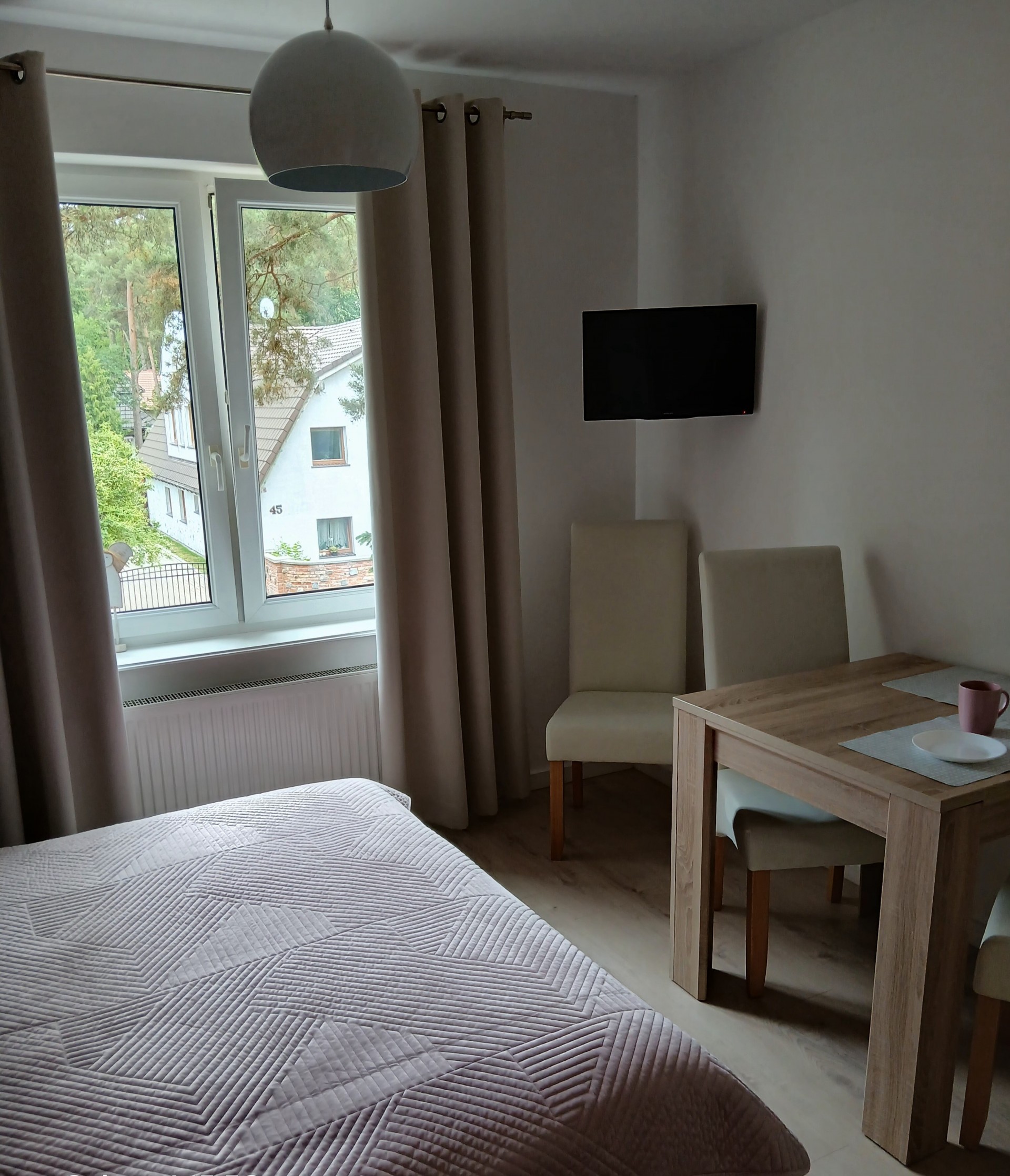 Przygotowaliśmy do Państwa 9 komfortowych pokoi i apartamentów. przygotowanych standardowo do przyjęcia od 2 do 5 osób. Wygodne i ciepło zaaranżowane wnętrza, łazienki, wysoki standard, indywidualne aneksy kuchenne w obrębie każdego pokoju oraz duży ogród zapewnią Państwu komfortowy wypoczynek. Każdy aneks kuchenny wyposażony jest w lodówkę, kuchenkę indukcyjną, czajnik, sztućce i naczynia. Apartamenty dodatkowo wyposażone są w kuchenkę mikrofalową. W każdym pokoju znajduje się leżak, koc i parawan na plażę. Część pokoi także ma swój taras lub balkon. Dla dzieci przygotowaliśmy mini plac zabaw: zjeżdżalnię ze ścianką wspinaczkową, huśtawki, bujak i trampolinę.