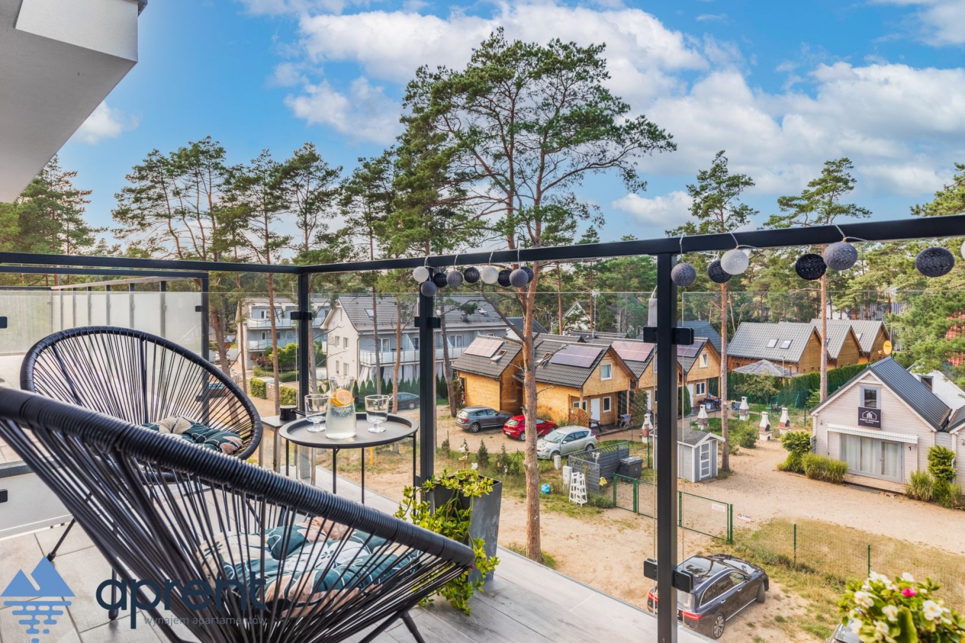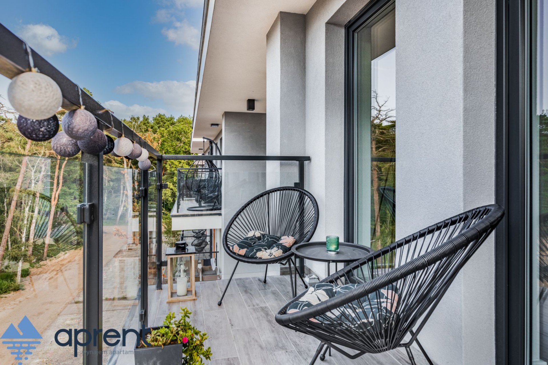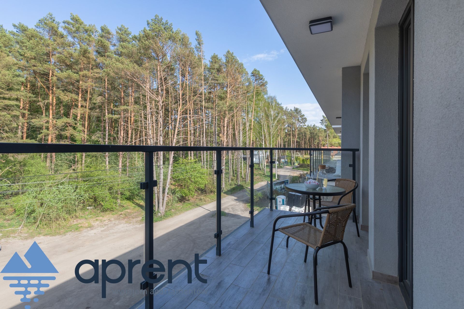 Apartament położony na drugim piętrze, z widokiem na las, składa się z salonu z aneksem kuchennym, sypialni, łazienki oraz balkonu z meblami ogrodowymi.