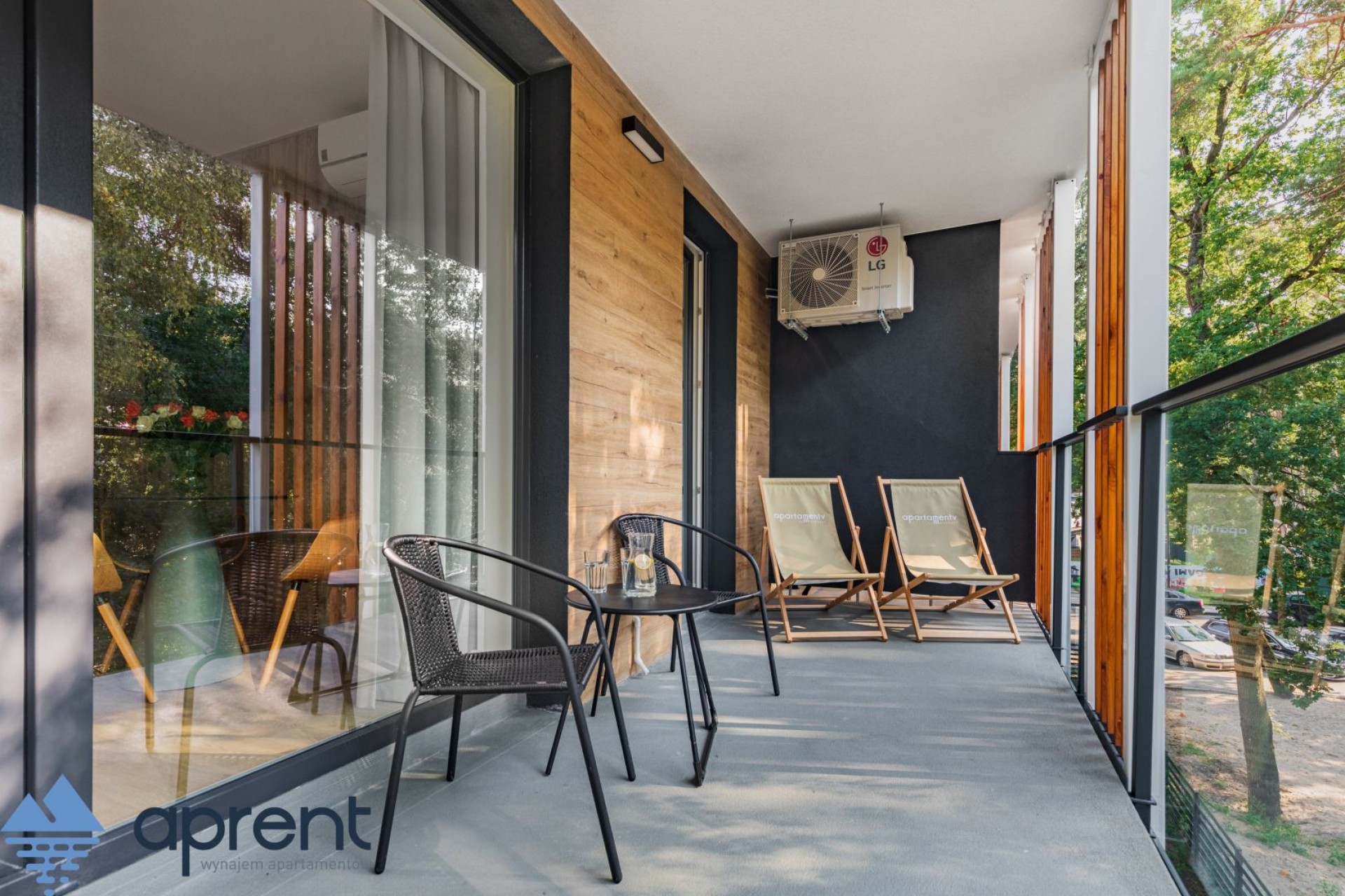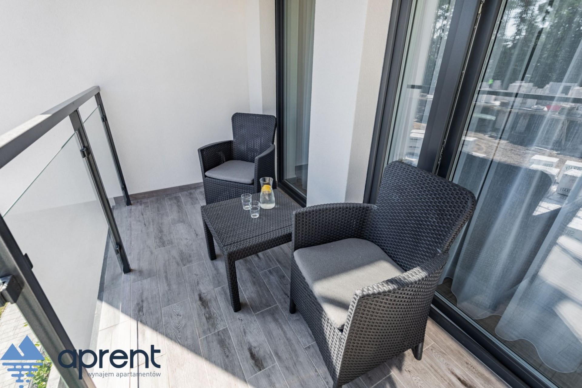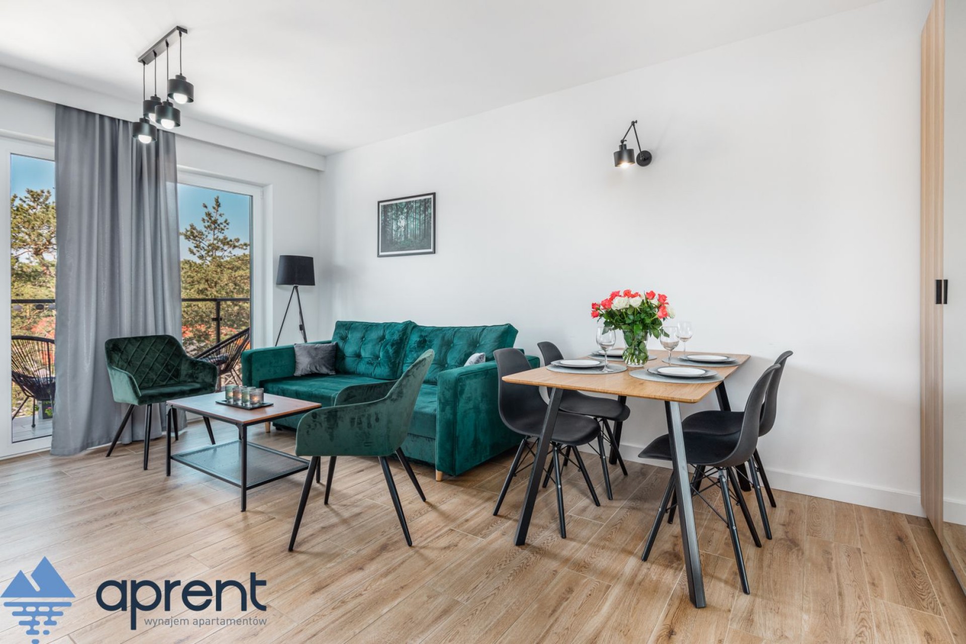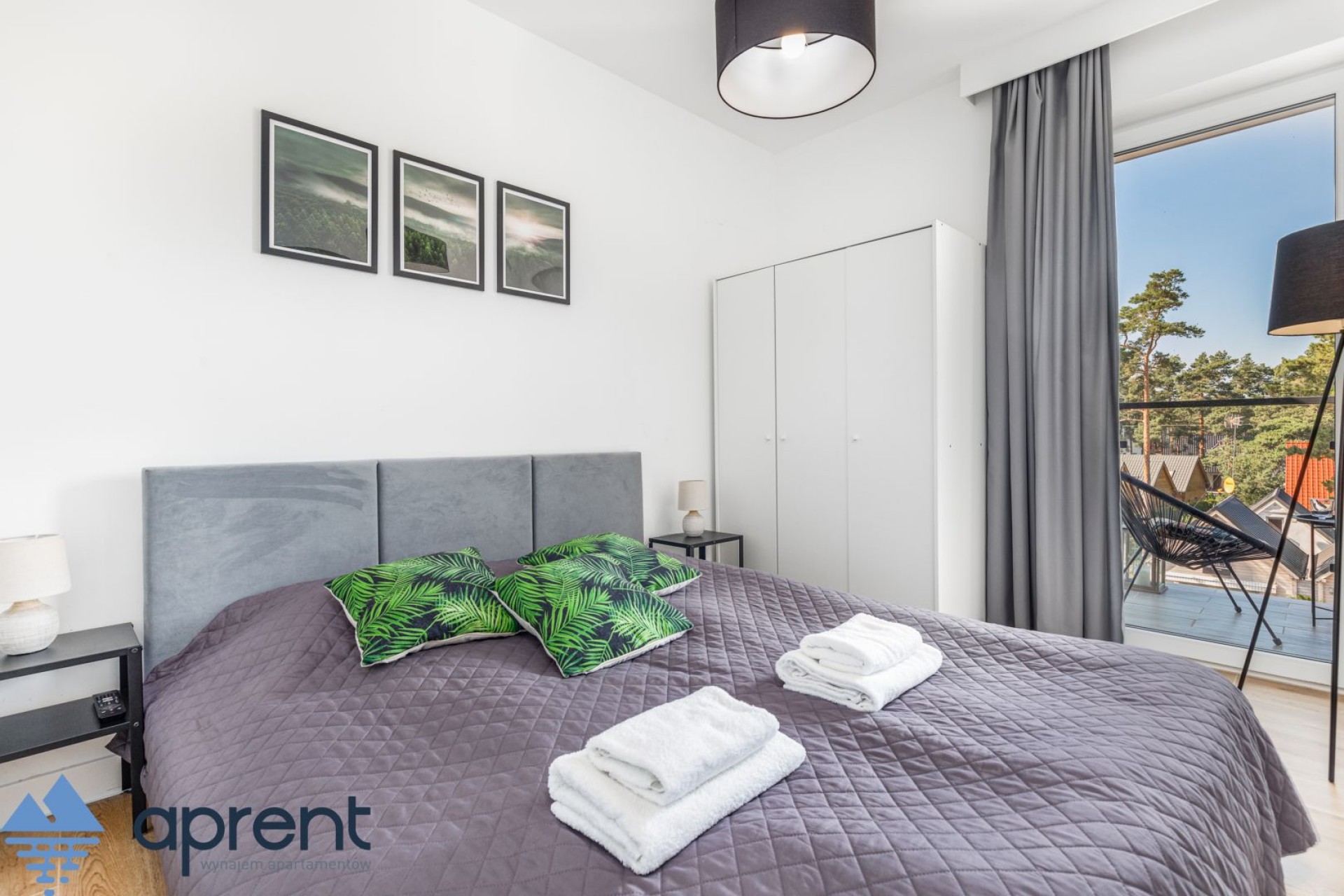 Apartament położony na drugim piętrze, z widokiem na las, składa się z salonu z aneksem kuchennym, sypialni, łazienki oraz balkonu z meblami ogrodowymi.