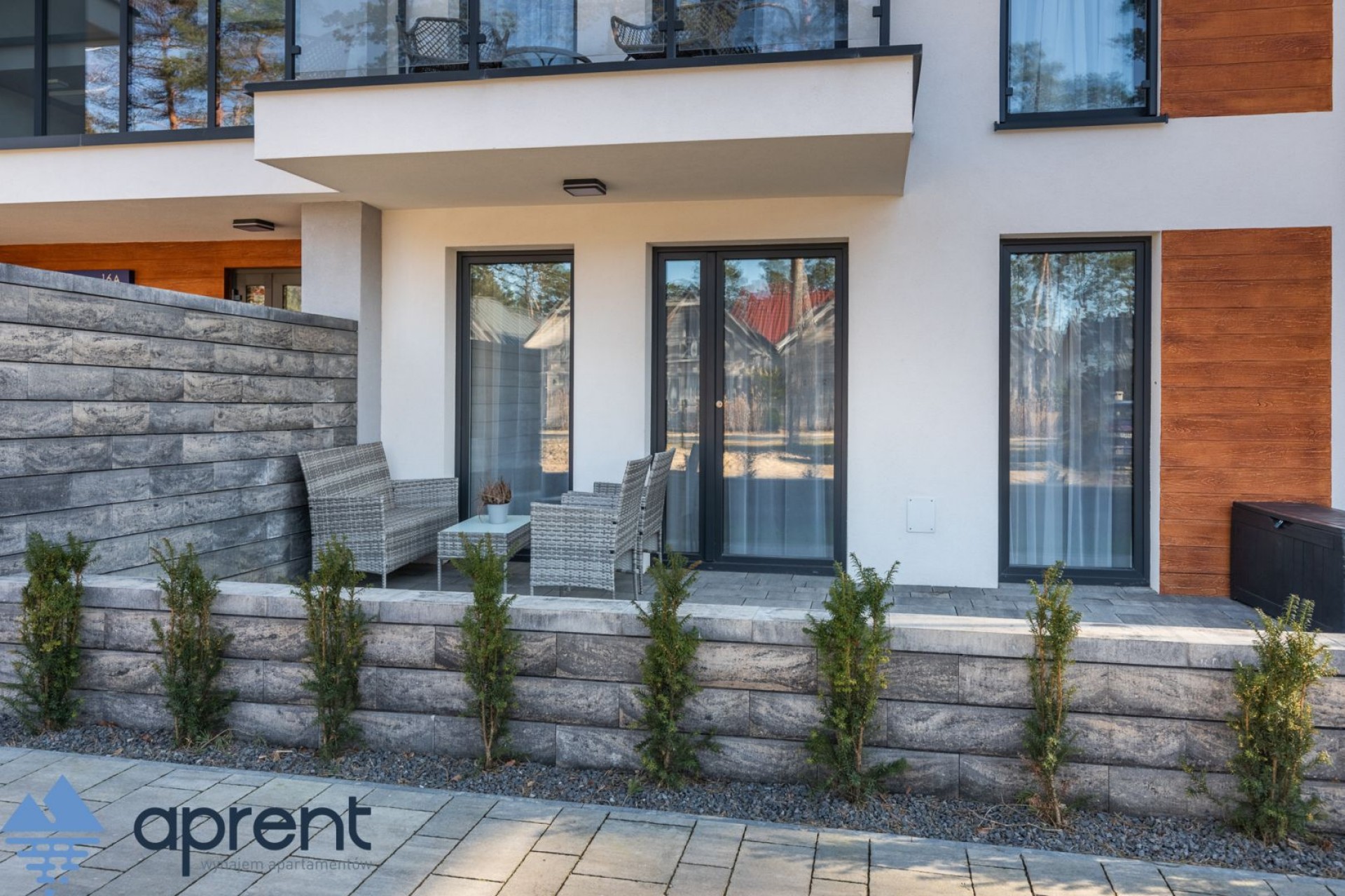 Apartament położony na parterze składa się z salonu z aneksem kuchennym, sypialni, łazienki oraz tarasu z meblami tarasowymi.