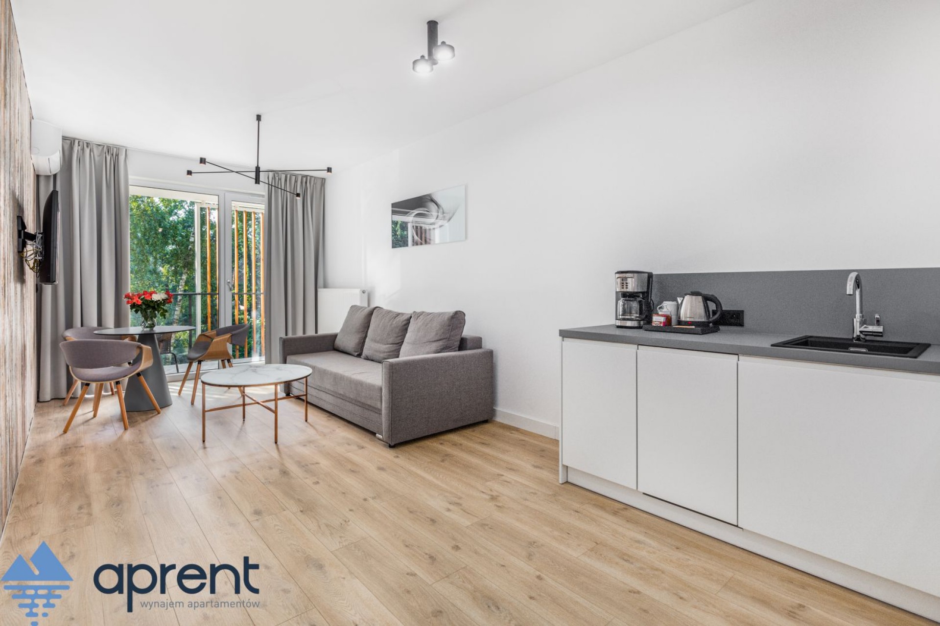 Apartament położony na pierwszym piętrze składa się z salonu z aneksem kuchennym, sypialni, łazienki oraz balkonu wyposażonego w meble ogrodowe.