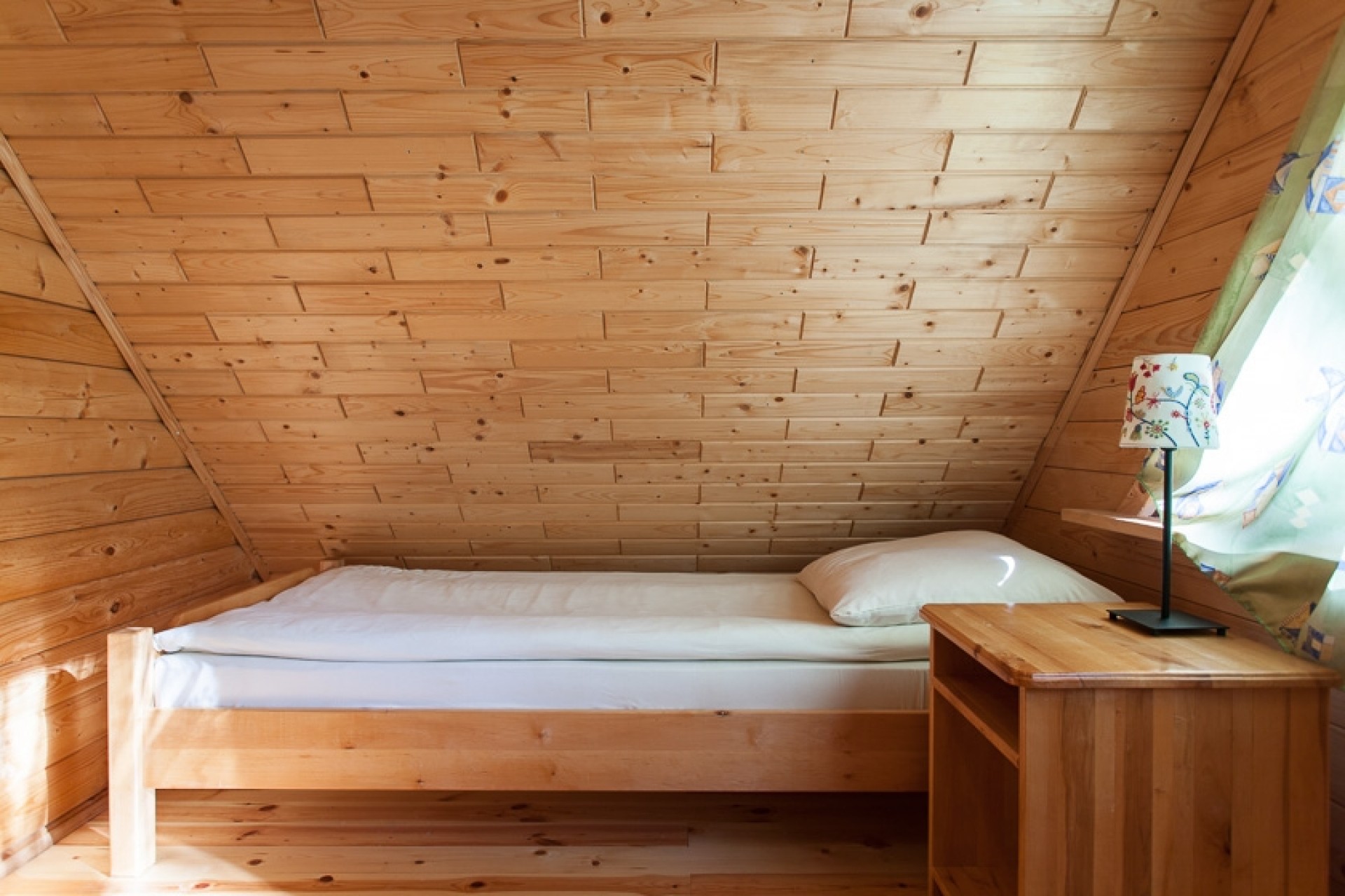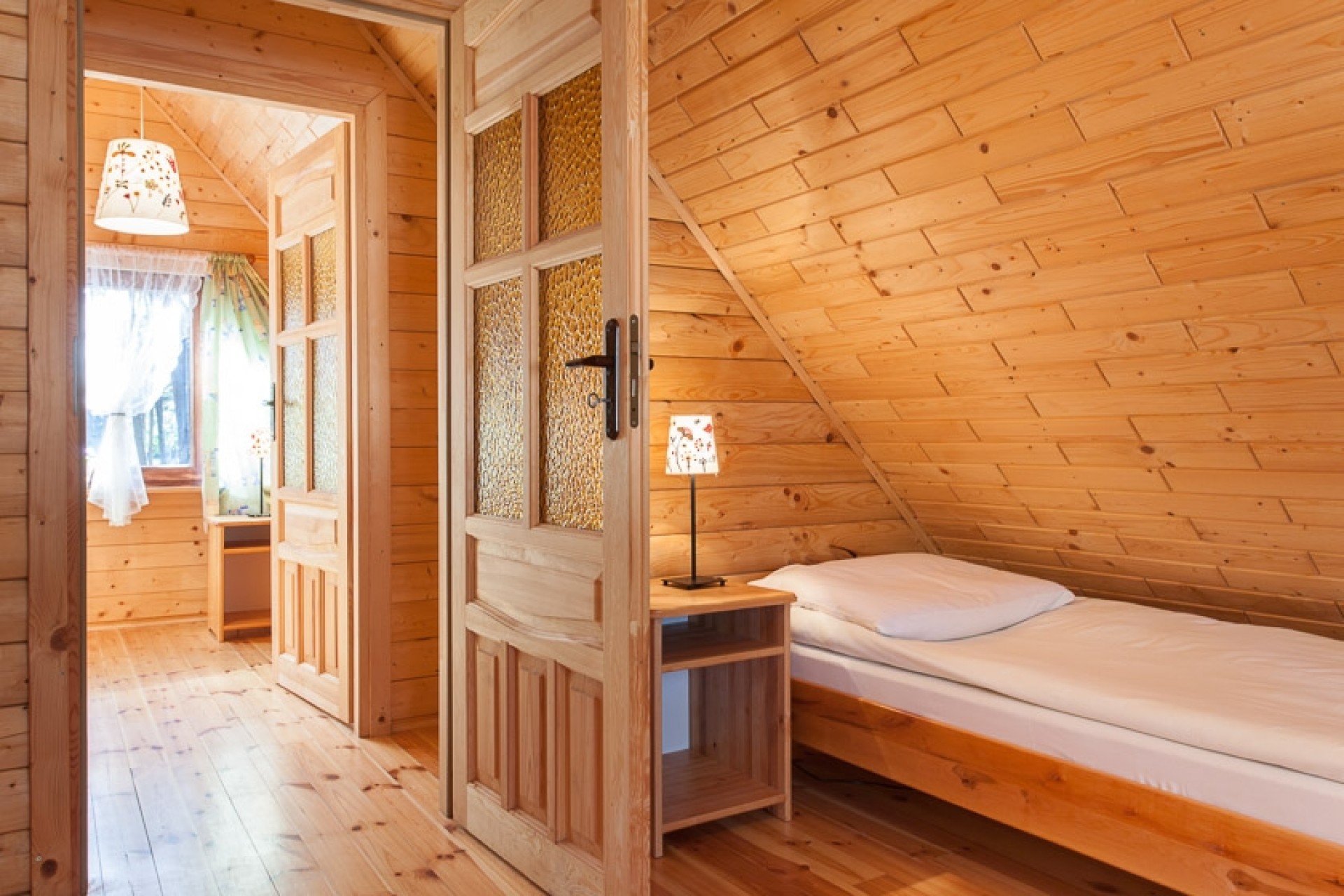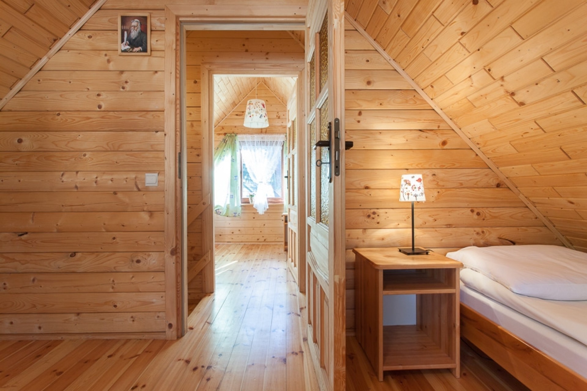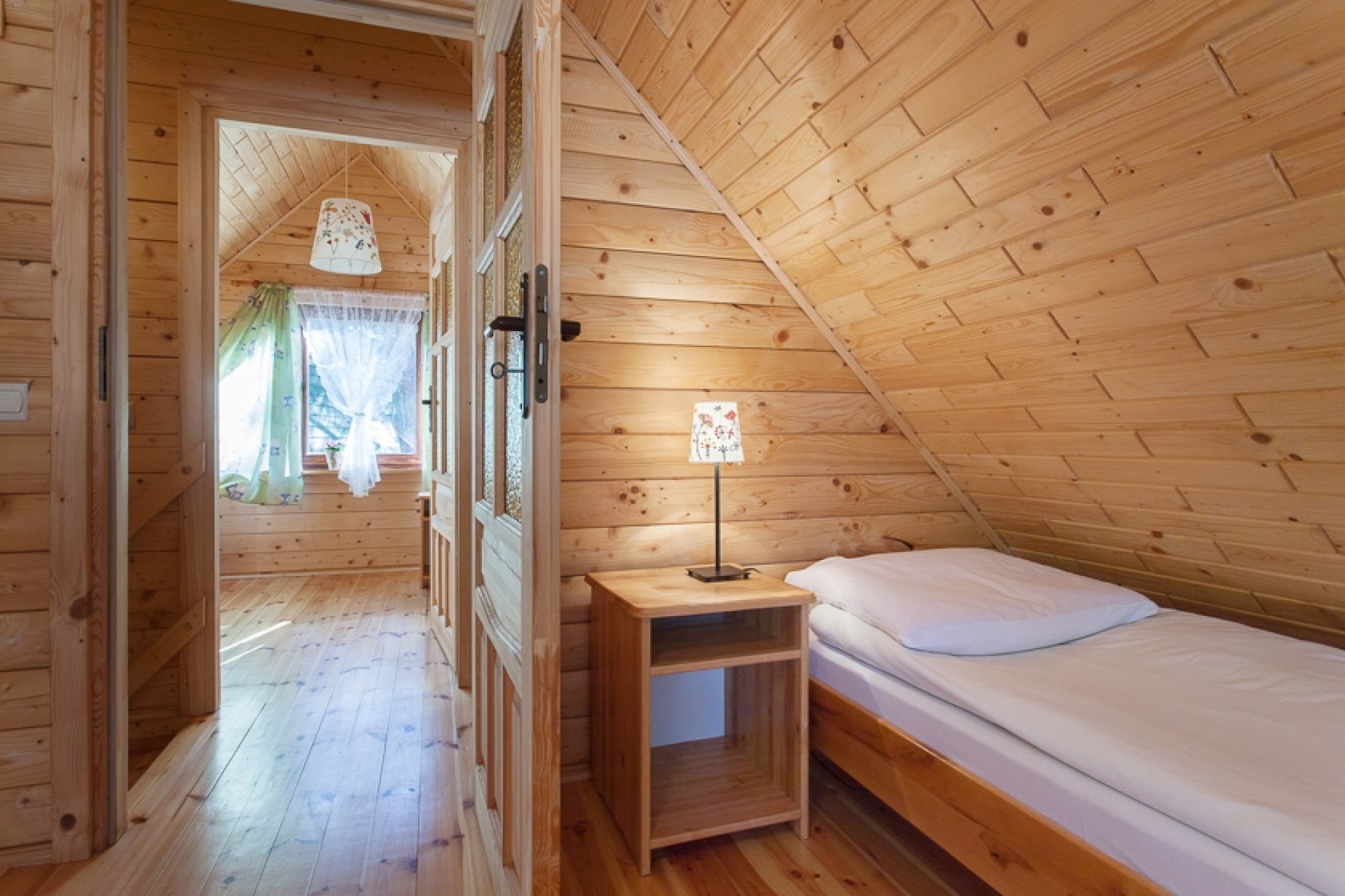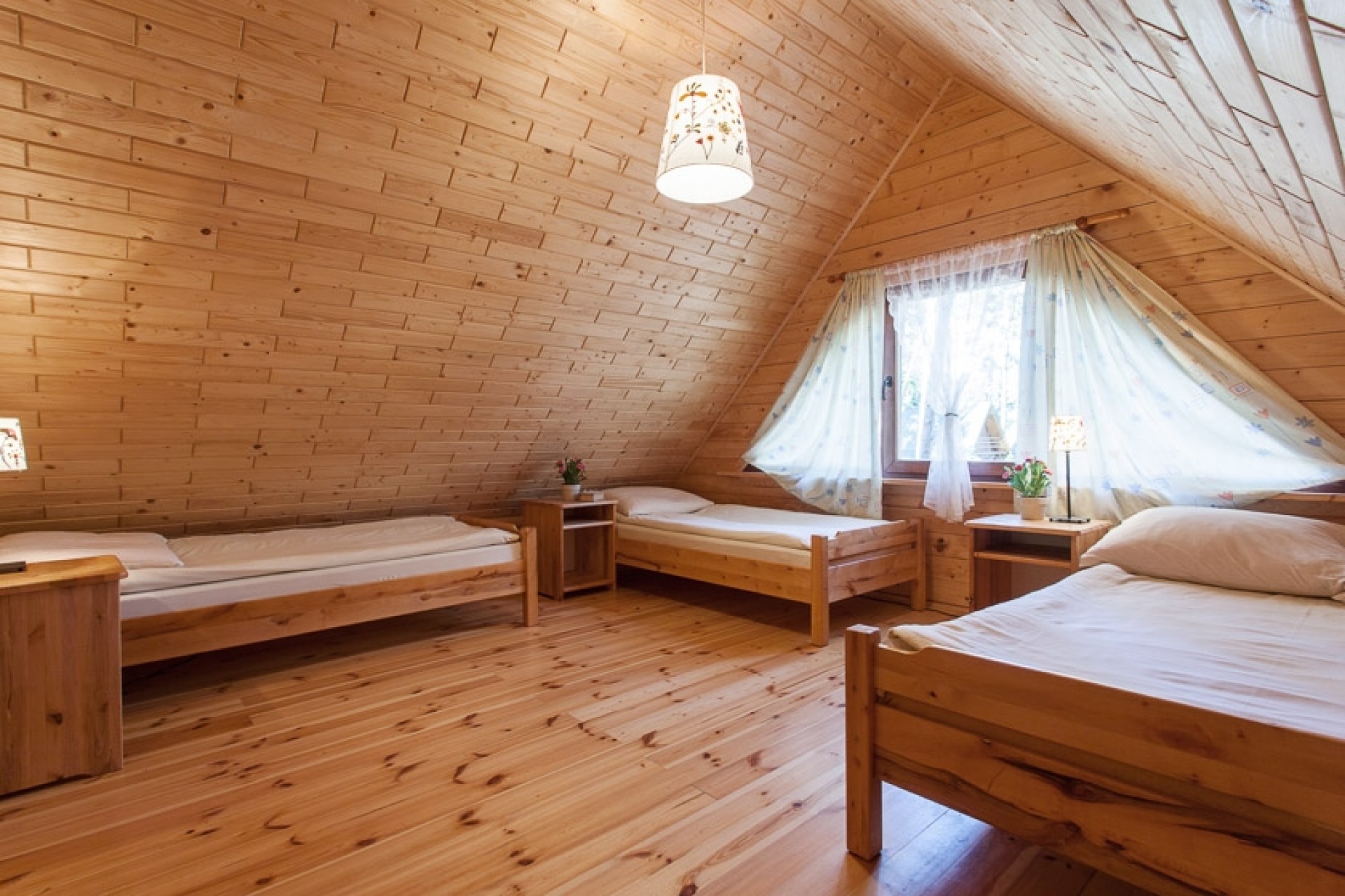 - Dwie osobne, zamykane sypialnie: w jednej łoże małżeńskie i 2 łóżka jednoosobowe, w drugiej łoże małżeńskie, łóżko jednoosobowe oraz łóżeczko drewniane.